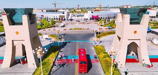 The China-Kazakhstan Khorgos International Border Cooperation Center located in the Khorgos Area of the China (Xinjiang) Pilot Free Trade Zone is always bustling with activities. The cooperation center spans the border between China and Kazakhstan, covering a total area of 5.6 square kilometers.